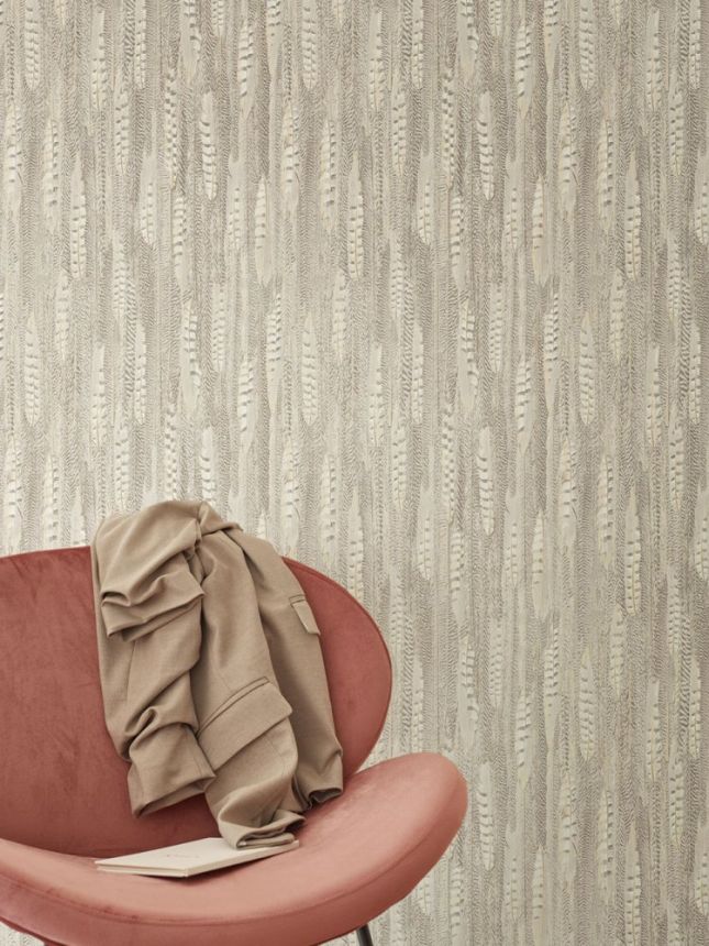 Sivo-ružová pololesklá, jemne plastická vliesová tapeta na stenu, vtáčie perá, pierka.