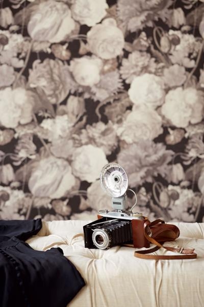 Ako z plátien starých majstrov. Kvetinový vzor v sivej a béžovej farbe na čiernom podklade.